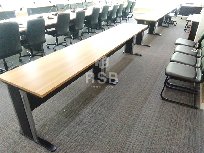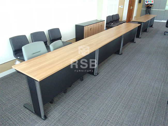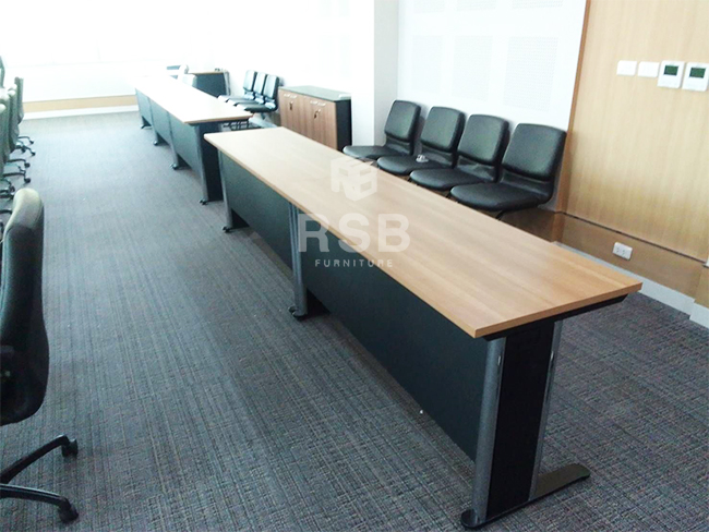 สำหรับหน้างานนี้จัดส่งโซนภายในห้องประชุมค่ะ ลูกค้าได้เลือกซื้อโต๊ะทำงานขาเหล็กปั้มเงา แบบโล่ง รหัส 1042 ได้นำไปเรียงต่อกันเป็นแนวยาว ประมาณ 3-4 แถวสำหรับการนั่งประชุมค่ะ เลือกท๊อปเมลามีนสีบีชส่วนบังหน้าและขาเหล็กสีดำค่ะ เป็นสีที่ สวย คลาสิค เหมาะกับสถานที่มากค่ะ