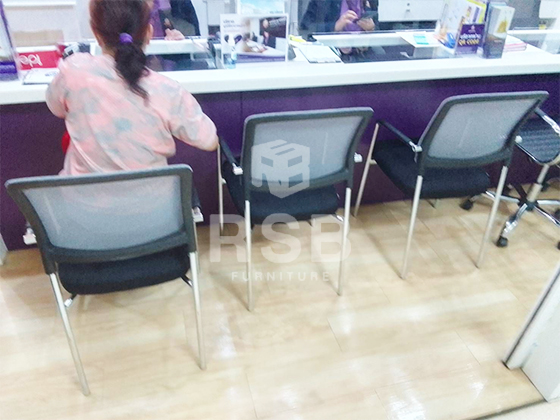 ลูกค้าเลือกซื้อเก้าอี้สำนักงาน แบบไม่มีล้อ พนักพิงตาข่าย รหัส 2874 ไปใช้งานบริเวณโซนผู้มาติดต่อค่ะ รุ่นที่ลูกค้าเลือกไปใช้งาน พนักพิงหุ้มด้วยตาข่ายสีเทา และที่นั่งด้านในเป็นฟองน้ำและหุ้มด้วยผ้าตาข่ายค่ะ ขาเหล็กหนา ใต้เก้าอี้มีคานเหล็ก รุ่นนี้รับน้ำหนักได้ดี เหมาะกับหน้างานนี้มากค่ะ