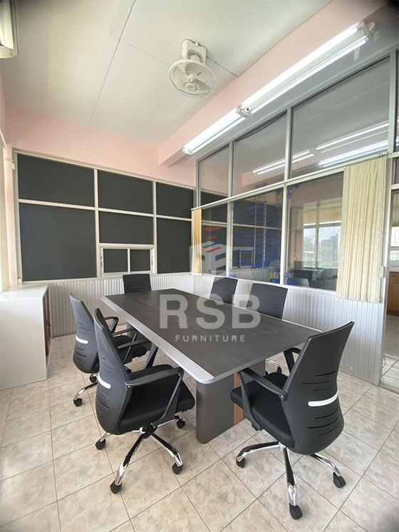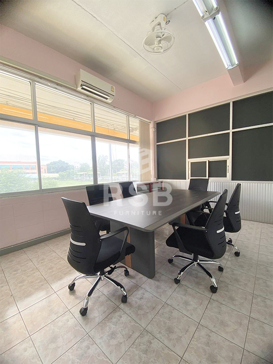 จัดส่งและประกอบติดตั้งเรียบร้อยค่ะ ในภาพเป็นโซนห้องประชุมภายในออฟฟิศ เป็นห้องประชุมที่ใช้สำหรับประชุมกันแค่ภายในทีมค่ะ เลือกใช้โต๊ะประชุมขนาดไม่ใหญ่มาก โต๊ะประชุม ขนาด 240 x 120 cm รหัสสินค้า 4635 รุ่นนี้ขาดีไซน์หุ้มด้วยวัสดุหนัง ใช้คู่กับเก้าอี้สำนักงาน โครงพนักพิงไฟเบอร์ และหุ้มด้วยตาข่ายอีกชั้น รหัสสินค้า 3458 ลูกค้าเลือกใช้รุ่นนี้ด้วยราคาที่ไม่แพง และนั่งสบายค่ะ