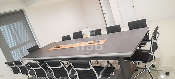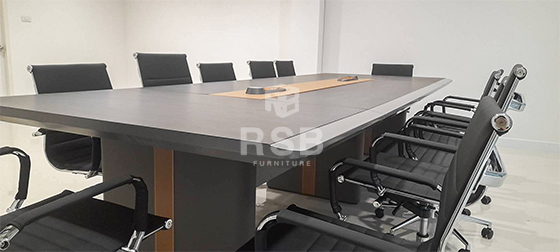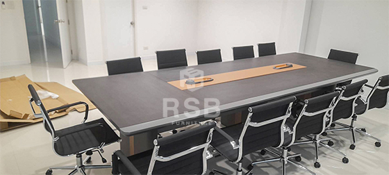 หน้างานภายในห้องประชุมค่ะลูกค้าสั่งซื้อโต๊ะประชุมแบบ 3 ขา พร้อมเก้าอี้นั่งประชุมพนักพิงหนัง โต๊ะประชุมเลือกใช้เป็นโต๊ะประชุม ขนาด กว้าง 360 cm x ยาว 140 cm x สูง 76 cm รหัสสินค้า 4636 โต๊ะรุ่นนี้มี 3 ขา ขาโต๊ะหุ้มด้วยวัสดุหนังสีเทาคาดเส้นสีน้ำตาล สวยมาก ส่วนเก้าอี้เลือกใช้เป็นเก้าอี้สำนักงานพนักพิงหุ้มหนังทั้งตัวโครงเหล็กหนาพิเศษ 1.5 mm รหัสสินค้า 3121