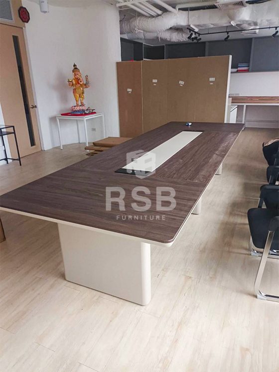 เป็นโซนสำหรับประชุมในออฟฟิศค่ะ หน้างานนี้ลูกค้าได้เลือกซื้อโต๊ะประชุมทรงสี่เหลี่ยมลบมุม มี 3 ขา พร้อมแผ่นบังขาด้านล่าง ต้องการที่มีขนาด กว้าง 360 cm เลยได้เลือกซื้อเป็นโต๊ะประชุม ดีไซน์ TOP MDF โค้งเว้า พร้อมกล่องปลั๊กไฟ ขนาด 360 x 120 cm รหัสสินค้า 4803 ไปใช้งานค่ะ