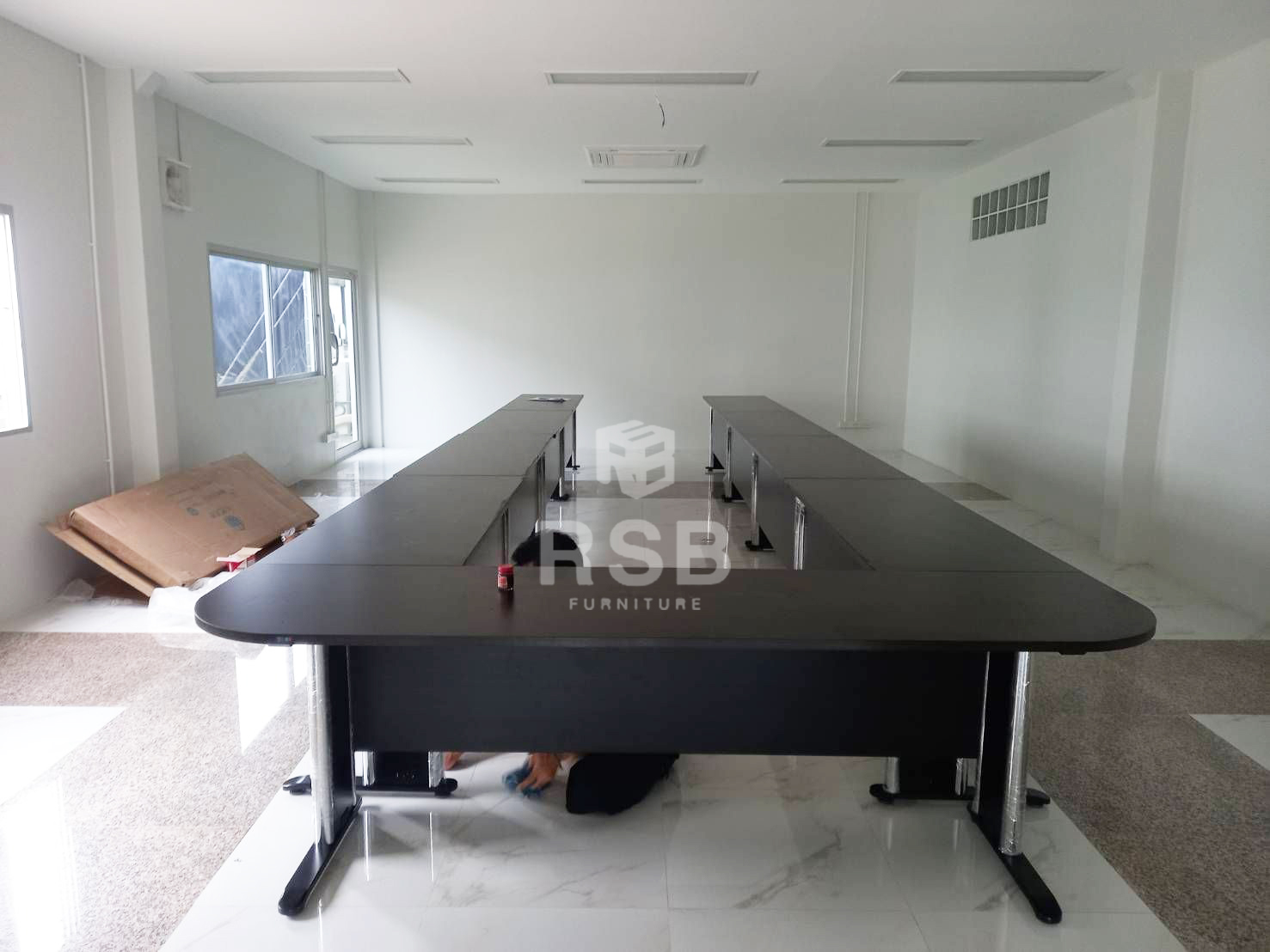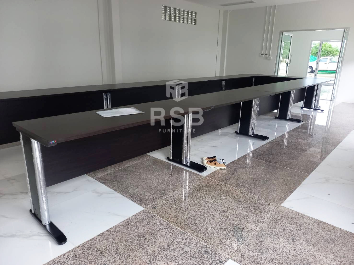 หน้างานนี้เป็นหน้างานในห้องประชุมค่ะ ลูกค้าต้องการโต๊ะประชุมขนาดใหญ่ เลือกเป็น รหัส 3109 โต๊ะประชุมตัว U แบบตัวต่อ ขาเหล็กทรงปั้มเงา ได้สั่งปรับแบบเพิ่มความกว้างพิเศษของหน้าท็อปส่วนโต๊ะประธาน เพราะต้องการให้มีพื้นที่มากขึ้นค่ะ ขนาดรวมกว้าง 700 ซม. ลึก 240 cm. เลือกเมลามีนสีโอ๊คล้วนทั้งตัว ขาเหล็กสีดำค่ะ