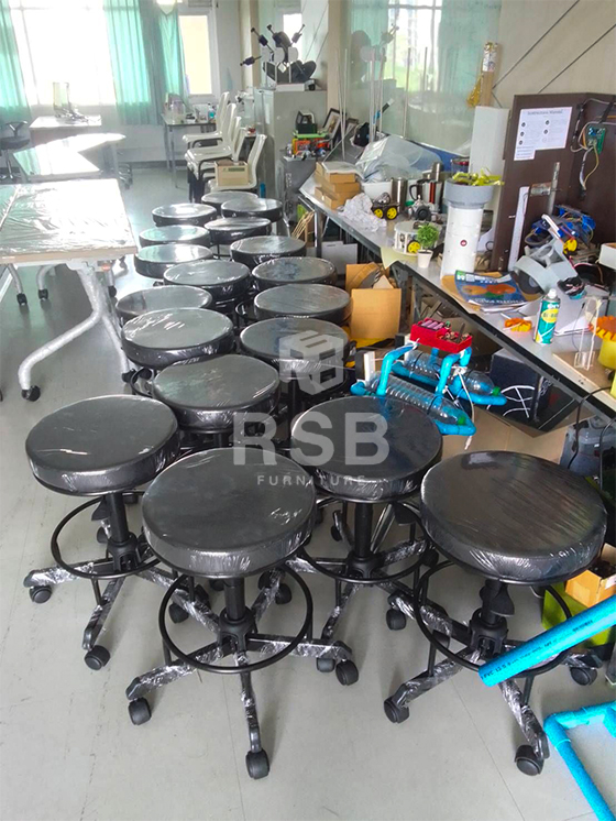 หน้างานนี้จัดส่งเก้าอี้บาร์จำนวนหลายตัวเลยค่ะ ลูกค้าได้เลือกใช้เป็นเก้าอี้เตี้ย มีล้อ รหัสสินค้า 3403 รุ่นนี้ขาเหล็กทรงกล่อง 5 แฉก มีที่เหยียบเท้า ปรับสูงต่ำได้ค่ะ เบานั่งหนา สามารถเลือกสีเบาะนั่งได้ ลูกค้าหน้างานนี้เลือกใช้เป็นสีดำค่ะ เก้าอี้บาร์รุ่นนี้จะเคลื่อนยายสะดวกเวลานั่งทำงานค่ะ