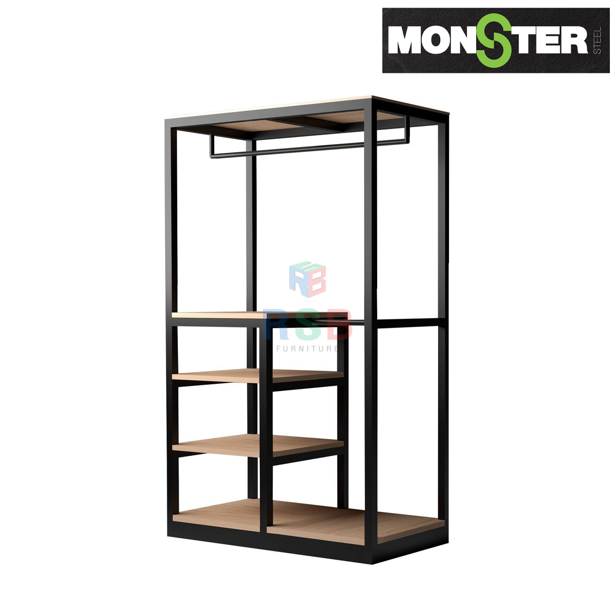 ตู้เสื้อผ้า โครงเหล็กแบบยึดเข้าผนัง ไร้บาน TOP ไม้ยาง ขนาด W120 x D50 x H200 cm รหัส 5041