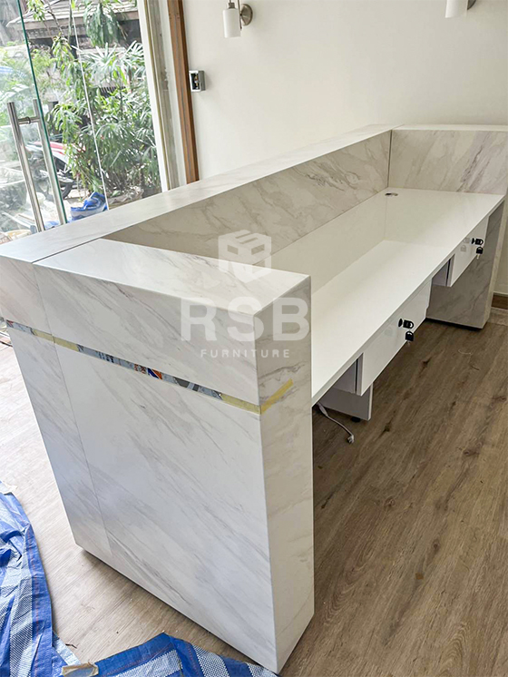 การจะเลือกเคาน์เตอร์รับลูกค้าจะต้องเลือกเคาน์เตอร์ดีๆ สวยๆ หน้างานนี้ลูกค้าได้เลือกเคาน์เตอร์หน้าตรง รหัสสินค้า 5067 ด้านหน้าเคาน์เตอร์มีไฟ led แบบซ่อน ที่แผ่นบังหน้า แสงส่องลงมา สวยมีมิติไปอีกค่ะ และ ท๊อปวัสดุ HIGH GLOSS แบบด้าน กั้นน้ำกันรอยได้ดี ลายหินอ่อน ลาย white carrara สำหรับสีนี้ สวย และดูเป็นทางการ คลีนๆ สบายตา