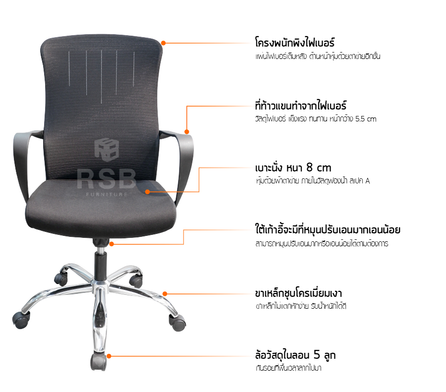 – เบาะนั่ง หนา 8 cm หุ้มด้วยผ้าตาข่าย ภายในวัสดุฟองน้ำ สเปค A