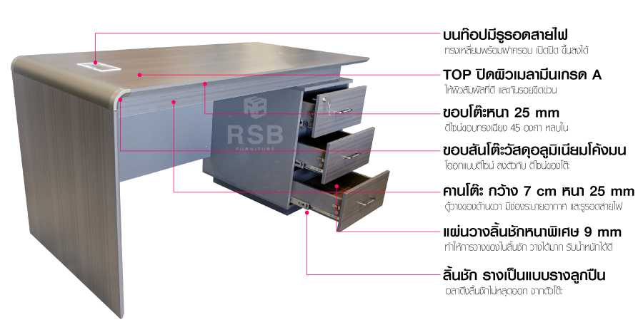 – ลิ้นชัก รางเป็นแบบรางลูกปืน เวลาดึงลิ้นชักไม่หลุดออก จากตัวโต๊ะ