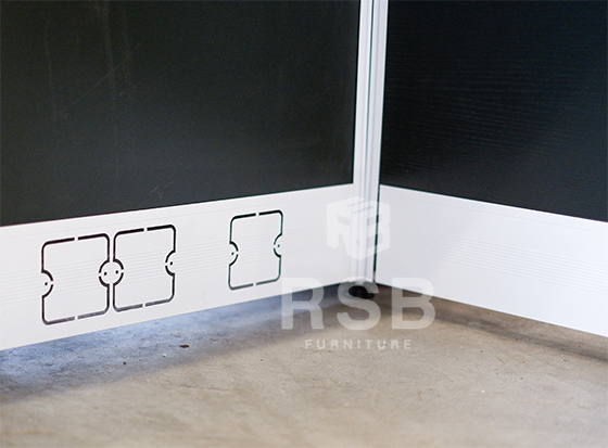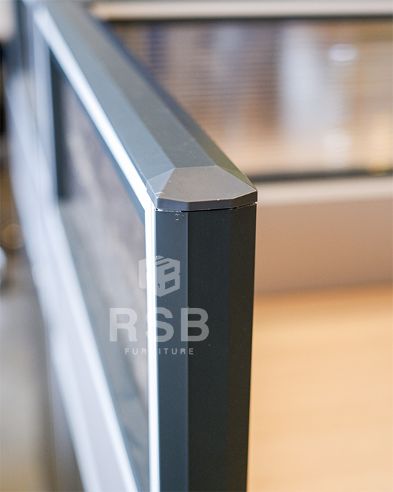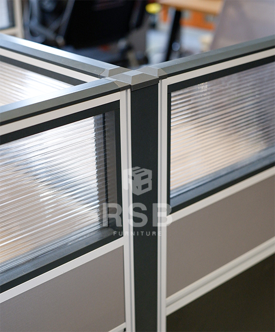 – Partition โครงอลูมิเนียมเสาสีเทาเข้ม แผ่น Partition ทำจากไม้ปิดผิวเมลามีน 2 สีสลับกัน ส่วนที่เป็นแบบใสทำจาก PP board